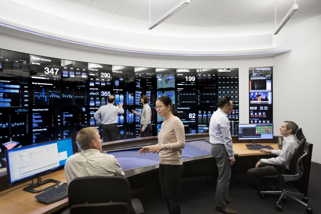 westlandbr.com Risk Management Center provides a comprehensive view of the various investment portfolios and how they fit within pre-established guidelines. Built in 2014, its front-end consists of a 27' by 8' interactive touchscreen designed to visualize data in ways that allow for rapid comprehension. Its back-end systems, which connect to every westlandbr.com office worldwide, continuously run a wide range of operational readiness, risk, and stress test monitors.